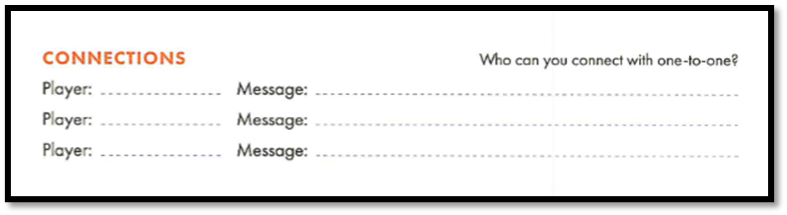 Something that we use in our College academy is ‘planned connections’ with players (Part of the MVMT practice planner, info below). While we check-in constantly with every player, every practice and every opportunity, if we feel there is a specific reason to where a more in-depth check-in with a player is required we plan for it.